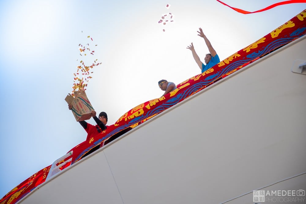 今天我們又送了一艘綁滿載旗的"祥慶財"魷釣船下水了! 有了這幾次的下水典禮拍攝經驗,這次的典禮活動拍攝少了幾分緊張、多了再次參與合作拍攝的興奮;新船下水典禮,除了獻香、命名與擲瓶,當地民眾與觀禮貴賓最期待的莫過於,象徵吉兆、祈求豐收平安的灑麻糬儀式,由船員們大把灑向地面的麻糬,讓民眾與貴賓分沾喜氣;我們在人群中穿梭、拍攝,時不時還會被從天而降的麻糬砸中,當地人出動雨傘、水桶、各種傢私,瘋搶漫天飛散的麻糬,熱鬧非凡。最後在鞭炮聲與煙花中,"祥慶財"緩緩駛進港內,新船下水儀式圓滿結束。